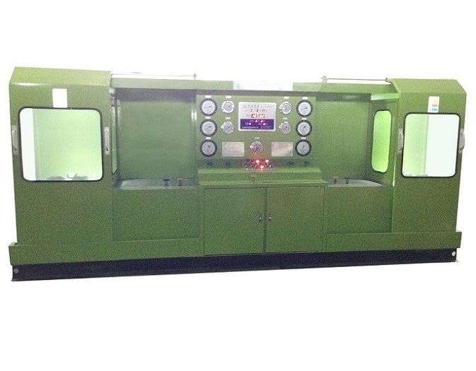 本機(jī)由液壓系統(tǒng)、機(jī)械部件,電器控制及多極氣源升壓裝置系統(tǒng)等部件組成。液壓系統(tǒng)是本試驗(yàn)臺(tái)的動(dòng)力主源。用于各類液壓缸和機(jī)械件驅(qū)動(dòng)執(zhí)行功能。試驗(yàn)面夾爪由液壓缸直接驅(qū)動(dòng)執(zhí)行,軸向夾緊壓力是按閥門(mén)試驗(yàn)壓力等級(jí)不同進(jìn)行調(diào)節(jié)增壓(最高液壓增壓壓力31 5MPa)。各夾爪受力均,夾緊可靠。徑向移動(dòng)由液壓缸傳動(dòng)執(zhí)行,各夾爪進(jìn)退同步,靈活自如,確保通徑大小不同閥門(mén)的測(cè)試。多極氣源升壓裝置是利用液氣聯(lián)動(dòng)增壓。增壓范圍0.6—32 0MPa,用于閥門(mén)介質(zhì)壓力試驗(yàn)。氣源升壓工作設(shè)有自動(dòng)和手控二種操作選擇,當(dāng)選用自動(dòng)升壓工作時(shí),工作人員可以近距離離開(kāi)操縱臺(tái)觀察現(xiàn)場(chǎng)試驗(yàn)情況。